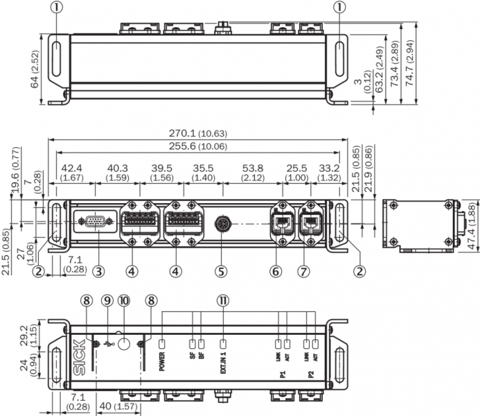 Электрическое подключение | 1 x разъем «DEVICE», 15-конт. гнездо D-Sub-HD с уплотнением 2 x разъем «POWER», 5-конт. штекер питания, Push-Pull, соотв. треб. AIDA 1 x Разъем «EXT. IN 1», 5-конт. гнездо M12, A-кодир 1 x разъем «P1 PROFINET», 8-конт. гнездо RJ45, Push-Pull, соотв. треб. AIDA 1 x разъем «P2 PROFINET», 8-конт. гнездо RJ45, Push-Pull, соотв. треб. AIDA 1 x USB-разъем, 5-конт. гнездо, тип Micro-B, для конфигурирования/диагностики, закрывается привинчивающейся крышкой |