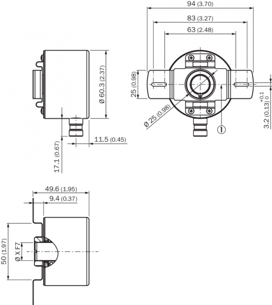 Габаритный чертеж Глухой полый вал, штекерный разъем, статорная муфта 2-сторонняя, удлиненные отверстия, окружность центров отверстий 63–83 мм