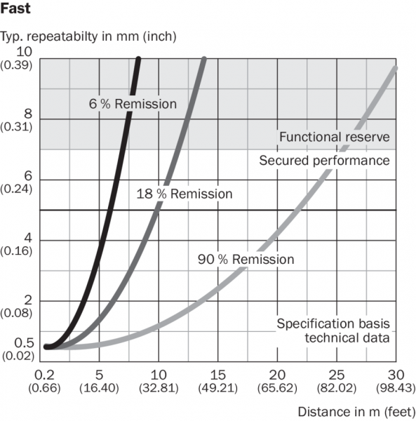| Диапазон измерения | 200 mm ... 30.000 mm, 90 % отражения 1) 2) 200 mm ... 17.000 mm, 18 % отражения 200 mm ... 10.000 mm, 6 % отражения |