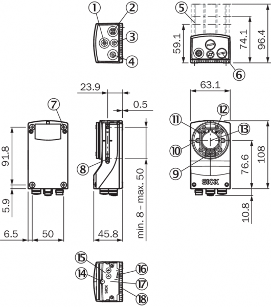 Один 17-контактный штекер М12 (последовательный, входы/выходы, источник питания) 1 шт. М8, 4-контактная розетка ((USB, не используется) 2 шт. М12, 8-контактная розетка (типа «гигабит Эзернет», используется только одно подключение) Один 4-контактный штекер М12 (внешнее освещение) |