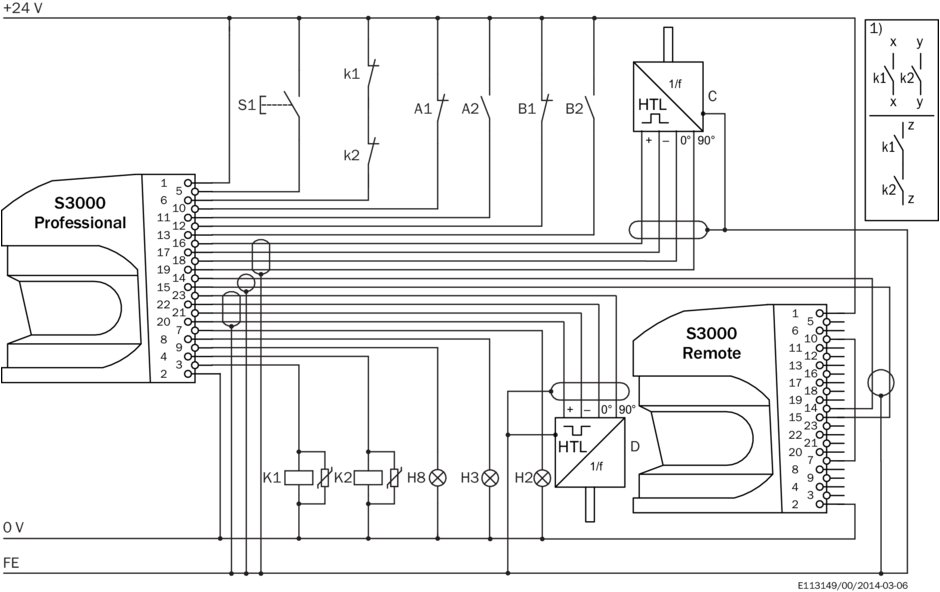 Пример схемы подключения Переключение защитного поля между двумя S3000 посредством статических и динамических входов