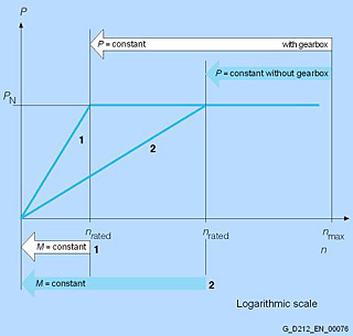 Обозначения:nrated ном. число оборотовnrated' ном. число оборотов с двухступенчатым переключаемым редукторомnmax макс. допустимое число оборотовPrated ном. мощность и постоянная мощность двигателя в диапазоне числа оборотов от nrated до nmax или nrated' до nmax
