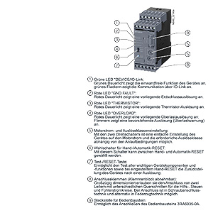 Кроме того, устройство 3RB24 имеет встроенное термисторное реле и таким образом обеспечивает полную защиту двигателя. В случае перегрева обмоток двигателя, устройство отключает его через силовой контактор и информирует о перегреве при помощи горения светодиода "THERMISTOR" и переeдает в ПЛК групповую ошибку через IO-Link.