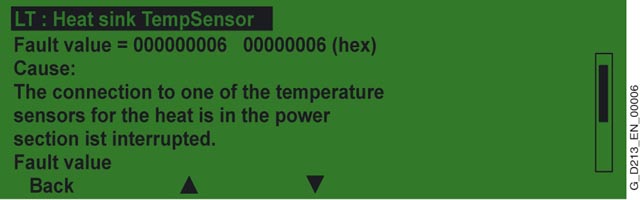 Любые происходящие Аварийные предупреждения отображаются мигающим желтым светодиодом «ALARM»; любые происходящие Аварийные сбои/отлючения отображаются горящим красным светодиодом «FAULT». В строке состояния дисплея при этом появляется дополнительное справочное текстовое сообщение о причине.
