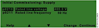 Для «Быстрого ввода в эксплуатацию» требуется ввести только 5 (пять) параметров электродвигателя: номинальная выходная мощность, частота вращения, номинальный ток, напряжение и частота сети. Эти данные можно получить на шильдике электродвигателя и, затем, ввести вручную с помощью краткого меню, отображаемого на дисплее.