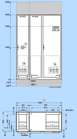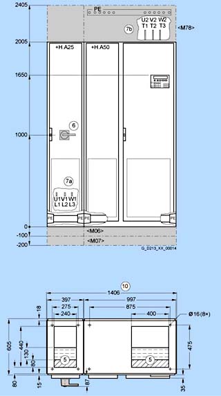 В этом случае высота шкафа увеличивается на 405 мм. Шины для подключения сверху поставляются полностью собранными. В целях транспортировки отсеки поставляются отдельно и должны быть установлены на месте. Можно также использовать компоновочные узлы кранового транспорта (опция M90). Однако, на месте их нужно убрать, чтобы закрепить отсек. Использование распределителей тросов рассматривается в случае небольшой высоты крюка крана.