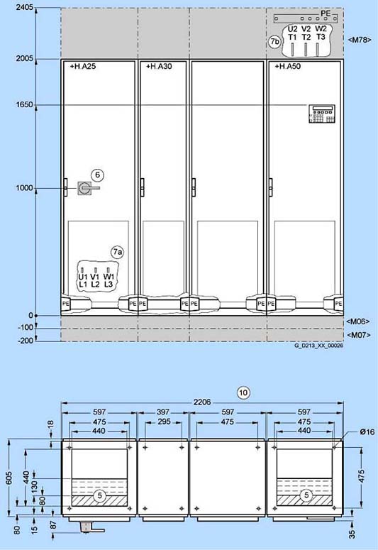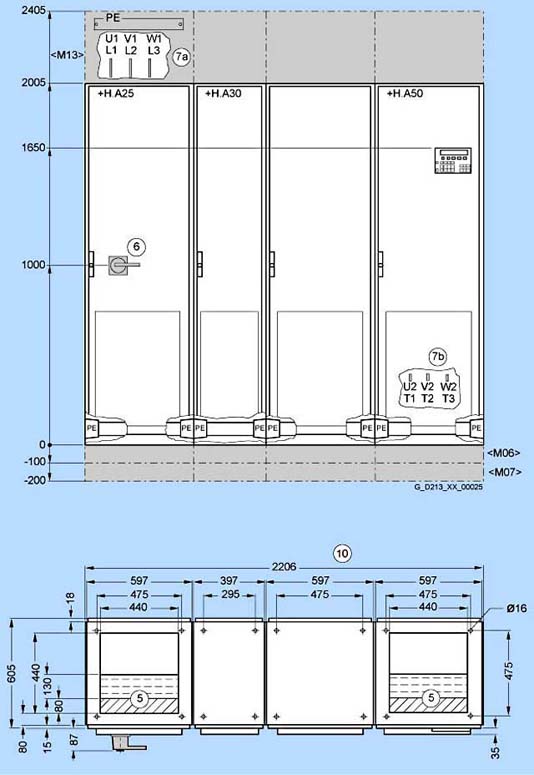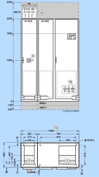 Шкаф управления оборудован дополнительным отсеком для случая, если сеть будет подключаться сверху. Этот отсек содержит клеммные соединения для силовых кабелей, а также кабельный зажимный рельс для механической поддержки кабелей, экранированную шину ЭМС и рельс PE.
