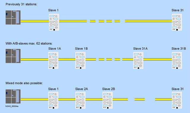 Технология A/BНовая спецификация AS-интерфейса версии 2.1 позволяет увеличить количество ведомых устройств с 31 до 62. В соответствии с этой спецификацией адресное пространство ведущего сетевого устройства разделяется на две подобласти, например, 1A и 1B. Использование двух подобластей адресного пространства применительно к 31 ведомому устройству позволяет подключать к AS-интерфейсу 62 ведомые станции. Так называемые A/B-ведомые устройства могут иметь до 4 входов и до 3 выходов.
