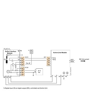 Активный интерфейсный модуль применяются в сочетании с активным модулем питания и необходим для его правильного функционирования. Активный интерфейсный модуль содержит высокочастотный дроссель ALM, фильтр Clean Power Filter с базовой помехозащитой согласно категории C3 по EN 61800‑3 для излучаемых радиопомех.