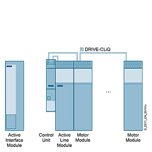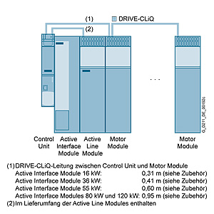 В зависимости от положения Активного интерфейсного модуля в системе приводов, могут потребоваться дополнительные кабели DRIVE-CLiQ. Если Активный интерфейсный модуль установлен с левой стороны Блока управления и Активного модуля питания, то никакие дополнительные кабели DRIVE-CLiQ не требуются. Если Активный интерфейсный модуль помещен между Блоком управления и Активным модулем питания, то кабели DRIVE-CLiQ, подводимые от Активного модуля питания, можно использовать для настройки топологии линии, т.е. подключение последовательно на одной линии DRIVE-CLiQ всех Моторных модулей и Активного модуля питания. Если Активный модуль питания подключен по отдельной линии DRIVE-CLiQ, то кабель DRIVE-CLiQ отмеченный (1) должен быть заказан. Кабель DRIVE-CLiQ, используемый для подключения (2), включен при поставке в комплектацию Активного модуля питания. Для подключения DRIVE-CLiQ в различных конфигурациях, смотрите раздел "Система связи".