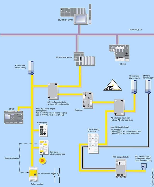 Область примененияКоммуникации процесса или полевые коммуникации Сложная разводка кабелей управления в электрошкафах и кроссовых шкафах, полностью занятых клеммниками, может быть заменена AS-интерфейсом. Благодаря специально разработанному резиновому кабелю (легко распознаётся по жёлтому цвету) и технологии прокалывания изоляции, кабель AS-интерфейса может подключаться где угодно. Эта концепция обеспечивает невероятную гибкость и высокую экономию средств. AS-интерфейс - это открытый стандарт (EN 50 295 / IEC 62026-2). Ведущие мировые производители актуаторов и датчиков поддерживают AS-интерфейс. AS-интерфейс применяется там, где отдельные актуаторы / датчики пространственно распределены по машине (например, на разливочной установке или производственной линии). AS- интерфейс заменяет сложные пучки кабелей и связывает дискретные и аналоговые актуаторы и датчикам, такие как бесконтактные переключатели, измерительные датчики, вентили или сигнальные лампы с системой управления SIMOTION. На практике это означает: установка происходит без проблем за счёт того, что данные и энергия передаются вместе по одному кабелю. Специальные испытания для установки и ввода в эксплуатацию не требуются. Кроме того, за счёт простой разводки кабеля, произвольной конфигурации сети, а также специальной формы кабеля Вы не только существенно снижаете риск ошибок, но и одновременно сокращаете издержки на сервисное обслуживание и эксплуатационные расходы. Безопасность включена Концепция ASIsafe обеспечивает непосредственную интеграцию компонентов, связанных с безопасностью, таких как аварийные выключатели, выключатель защитной двери и защитный световой занавес безопасности, непосредственно в AS-интерфейс. Они полностью совместимы с другими компонентами AS- интерфейса (ведущие, ведомые, источники питания, повторители и т. д.) и работают вместе с ними по жёлтому кабелю AS- интерфейса. Сигналы датчиков безопасности оцениваются монитором безопасности. Он наблюдает не только за коммутацией сигналов датчиков безопасности, но и постоянно проверяет корректность передачи данных. В зависимости от варианта монитор безопасности имеет одну или две цепи разрешения, разомкнув которые он переводит машину или установку в безопасное состояние. Каждая цепь разрешения имеет 2 коммутационных контакта для выполнения требований Категории надежности 4 по EN 954-1 или SIL 3 по IEC 61508. Датчики и мониторы могут подключаться к сети AS-интерфейса в любом месте. Также возможно применение нескольких мониторов безопасности в сети. Отказоустойчивый контроллер или специальный ведущий не требуется. Ведущее устройство рассматривает безопасные ведомые устройства так же, как и все остальные ведомые. Анализ защитных данных производит защитный монитор. Таким образом, могут расширяться уже существующие сети AS-интерфейса. |