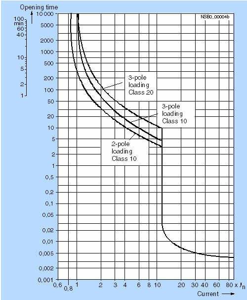 Номинальный ток In в подлежащих защите двигателях настраивается по шкале настройки. Расцепитель короткого замыкания по заводской установке срабатывает при 13-кратном превышении расчетного тока в выключателе. При этом осуществляется бесперебойная работа и уверенная защита двигателя. Чувствительность выключателя к выпадению фазы гарантирует, что выключатель при выпадении одной фазы и вызванных этим перегрузках в других фазах будет вовремя отключён. Автоматические выключатели с тепловыми расцепителями перегрузки обычно относятся к классу расцепления 10. Автоматические выключатели типоразмера S2 и S3 представлены также с классом расцепления 20 , что допускает пуск двигателей в сложных эксплуатационных условиях.
