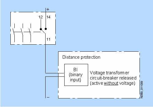 При подключении защитного выключателя с преобразователем напряжения через замыкающий контакт (НО) двоичный вход дистанционной защиты (Siemens 7 SA xxx) должен быть установлен в положение «активен без напряжения». Этот способ подключения позволяет дополнительно контролировать правильность выполнения электромонтажа.