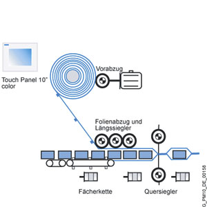 Горизонтальная упаковочная машина в этом примере нуждается в более мощных силовых частях, чем имеющиеся в ком фортных пакетах SIMOTION Easy Set - фасовка и упаковка. Поэтому для автоматизации применяется базовый пакет SIMOTION Easy Set - фасовка и упаковка. Силовые части и лицензии нужно заказывать отдельно (см. дополнительные компоненты). Двигатели выбираются пригодные для монтажа серворедукторов.