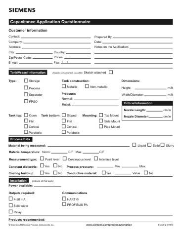 IntroductionInverse frequency shift capacitance point level and continuous level switches are designed to withstand the harsh environments of high pressure and high temperature applications. Inverse Frequency TechnologySiemens Milltronics inverse frequency shift capacitance instruments incorporate a unique frequency-based approach to level measurement. The capacitance units monitor the effect of capacitance based on frequency change. The relationship between capacitance and frequency is inverse. Because small level changes result in a large frequency change, the result is excellent resolution and accuracy. Principle of OperationInverse frequency shift capacitance instruments require two components: a reference electrode of a variable capacitor, and the measurement electrode. In capacitive level measurement, the environment (typically the vessel wall) acts as the reference electrode, while the probe supplies the measurement electrode. The dielectric is composed of the vessel contents, and, if the measurement electrode is insulated, the insulating layer.