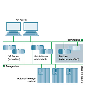SIMATIC PCS 7 OS Server (BCE-интерфейс) с Microsoft Windows Server 2003 операционной системой, предлагаемый в главе "SIMATIC PCS 7 Industrial Workstation" в секции "Системно-независимые компоненты", может использоваться в качестве базового аппаратного обеспечения CAS. ПО сервера системы управления процессами SIMATIC PCS 7 V7.0 предустановлен на устройстве в дополнении к операционной системе. Для конфигурирования центрального архивного сервера (CAS) требуется базовое ПО архивного сервера (Central Archive Server Basic Package). С помощью пакетов расширений общее число архивируемых переменных может быть доведено до 120000 (SIMATIC PCS 7 Archive/SIMATIC PCS 7 Archive PowerPack лицензии). Детальную информацию о политике лицензирования архивирования на CAS вкупе с OS станциями может быть найдена в подсекции "Характеристики архивных переменных и лицензирование кратковременного и долговременного архивов" секции "OS архивирование".