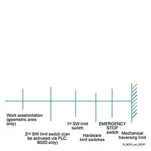Активируемые и настраиваемые через установочные параметры нижние и верхние ограничения рабочей зоны могут быть изменены командами G25/G26. Ограничения рабочей зоны ограничивают область перемещения осей в дополнение к конечным выключателям. В рабочем пространстве станка устанавливаются защитные зоны, которые заблокированы для движений инструмента и защищают от повреждений такие узлы станка, как револьверную головку, измерительные станции и т. п.