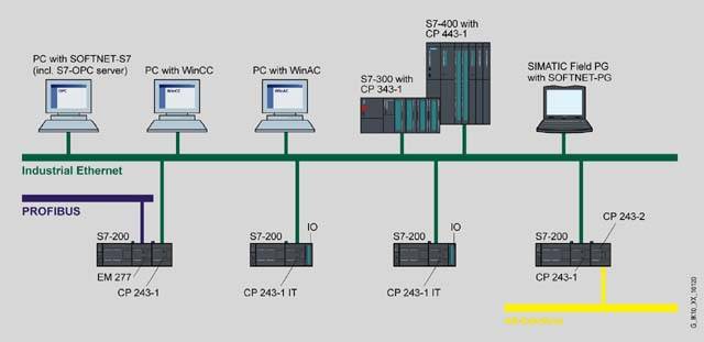 CP 243-1 позволяет организовать обмен данными через Industrial Ethernet между S7-200 и программируемыми контроллерами S7-200/ S7- S7-300/ S7-400.