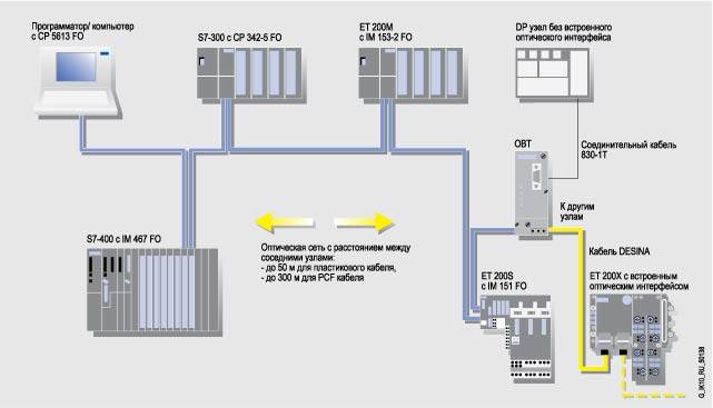 Проектирование Конфигурирование коммуникационного процессора CP 342-5 FO выполняется с помощью пакета NCM S7 для PROFIBUS. NCM S7 является составной частью пакета STEP 7 от версии 5.0 и выше. Параметры настройки CP 342-5 FO записываются в память центрального процессора S7-300 (STEP 7 от версии 5.0 и выше). Это позволяет сохранять параметры настройки при перебоях в питании контроллера, а также производить замену коммуникационного процессора без повторного конфигурирования вновь устанавливаемого модуля. Запуск центрального процессора будет автоматически сопровождаться передачей всех параметров настройки в коммуникационный процессор. Конфигурирование и программирование всех сетевых станций SIMATIC S7 может выполняться дистанционно через сеть PROFIBUS. Функциональные блоки поддержки протокола PROFIBUS DP включены в стандартную библиотеку STEP 7. Функциональные блоки поддержки функций S5-совместимой связи (SEND/RECEIVE), а также функций S7-клиента помещены в библиотеку SIMATIC NET пакета NCM S7. Конфигурация оптического PROFIBUS DP с CP 342-5 FO