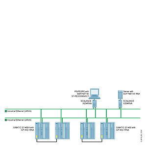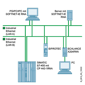 Программируемые контроллеры SIMATIC S7-400/S7-400H подключаются к двум параллельным сетям Industrial Ethernet через два гнезда RJ45 коммуникационного процессора CP 443-1 RNA. Коммуникационный процессор поддерживает протокол PRP в соответствии с требованиями стандарта IEC 62439-3. Он дублирует все телеграммы и отправляет их по двум подключенным сетям. Приемник фиксирует адресованное ему сообщение, пришедшее первым. Второе сообщение игнорируется.