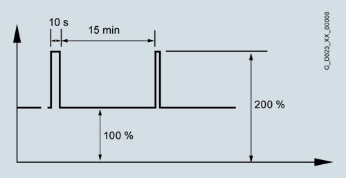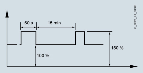 Указанный на типовой табличке преобразователя номинальный постоянный ток (максимально допустимый длительный ток) во время работы может превышаться. Для величины превышения и его длительности существуют границы, суть которых разъясняется ниже.
