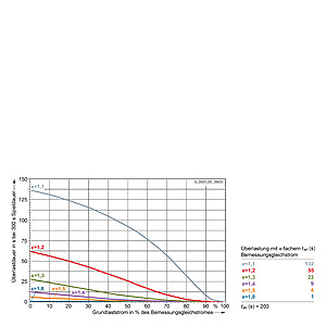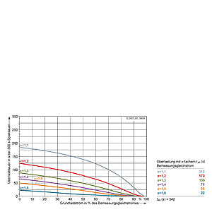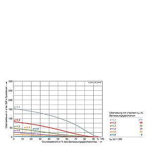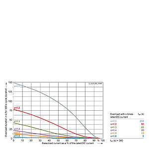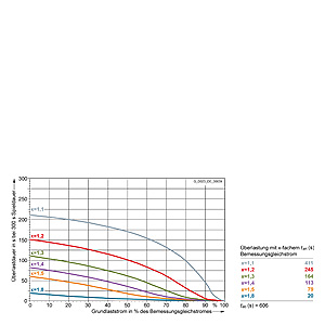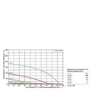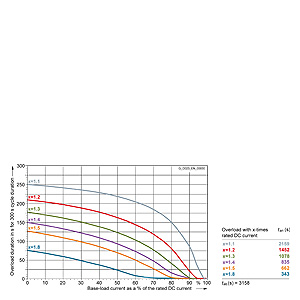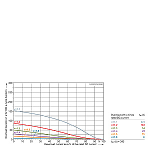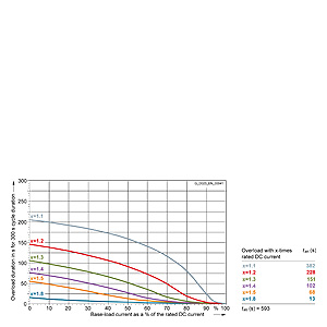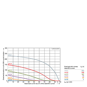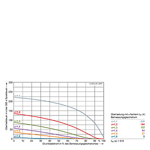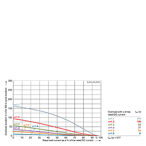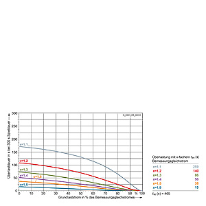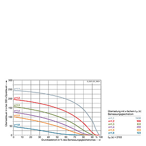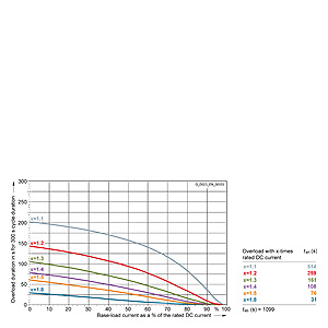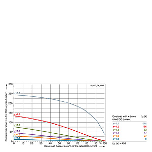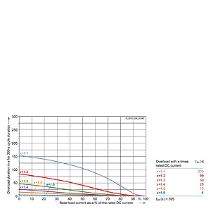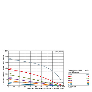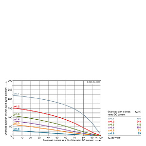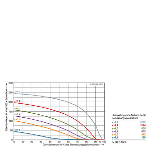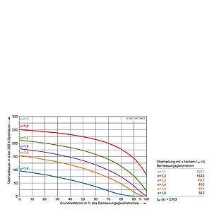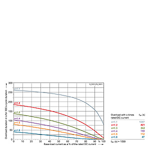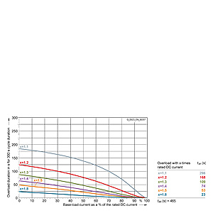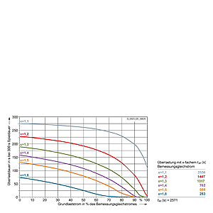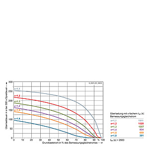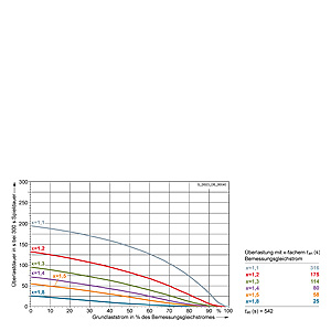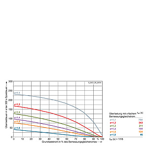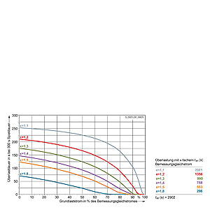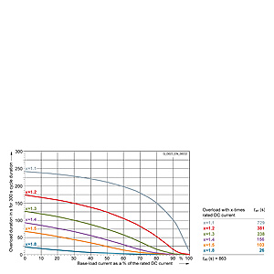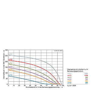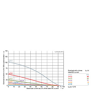 Каждая граничная кривая представляет собой специфичный для преобразователя при соответствующем коэффициенте перегрузки максимальный ток основной нагрузки (граничный ток нагрузки, заданный в % от номинального постоянного тока) в течение минимального времени перегрузки (граничное время перегрузки). Тогда для остаточного времени пика нагрузки допустим максимальный ток, определяемый коэффициентом перегрузки. Если для желаемого коэффициента перегрузки не задана граничная кривая, то следует руководствоваться граничной кривой для следующего коэффициента перегрузки.