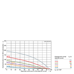 Семейство граничных кривых ссылается соответственно на время цикла периодического режима перегрузки общей длительностью (временем периода) в 300 сек. Само время цикла делится на два временных отрезка: основная длительность (текущее значение якорного тока ≤ номинального тока) и длительность перегрузки (якорный ток ≥ номинального).