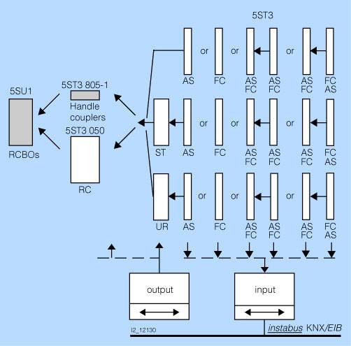 • установка на защелках • механическая блокировка и запирание • возможность установки других дополнительных компонентов • переключатель выбора функций на передней панели • подключение к шине instabus KNX/EIB и AS−интерфейсу при помощи двоичных входов и выходов • Un = 230 В, от 50 до 60 Гц - Все дополнительные компоненты 5ST3 согласно концепции могут комбинироваться с автоматами серий 5SY и 5SP4