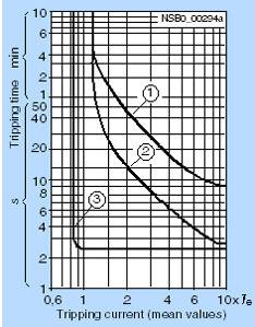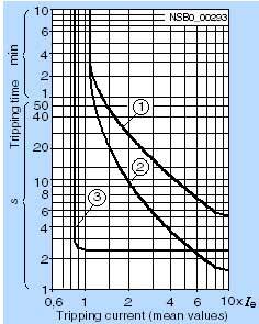Характеристика расцепления реле перегрузки с трехполюсной нагрузкой из холодного состояния (см. кривую «1») справедлива при условии, что на все три фазы одновременно нагружены одинаковым током. При выпадении фазы или несимметрии фаз более чем на 40 % электронное реле перегрузки 3RB10 отключает контактор, и, таким образом, потребителя, в пределах 3 секунд. Благодаря быстрому расцеплению в соответствии с кривой для двуполюсной нагрузки из холодного состояния (кривая «3») нагрев потребителя сводится к минимуму. В отличие от потребителя в холодном состоянии, при рабочей температуре потребитель неизбежно имеет меньший температурный запас. С учетом этого обстоятельства для электронных реле перегрузки 3RB10 после длительной нагрузки током уставки Ie в соответствии с кривой для симметричной нагрузки для прогретого состояния (см. кривую «2») время расцепления сокращается примерно на 30 %