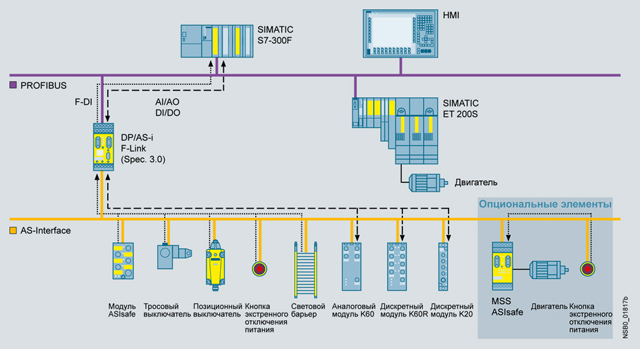 Ведущие PROFIBUS DP в соответствии с DP-V0 или DP-V1 могут обмениваться данными с низкоуровневыми ведомыми устройствами AS-интерфейса в циклическом режиме. Ведущие интерфейса PROFIBUS DP в нециклическом режиме, согласно DP-V1 доступны при вызове определынных комманд AS-интерфейса. Вдобавок к цифровым входным выходным данным, аналоговые данные также могут быть сохранены непосредственно в периферии S7-300/S7-416 F-CPU.