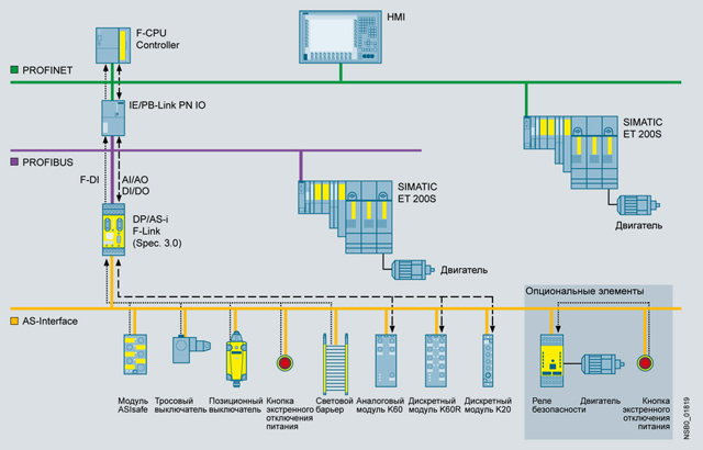 Конфигурация 2: Интеграция в PROFINET сети под SIMATIC F ПЛК (SIMATIC S7-315 F PN/DP, S7-317 F PN/DP или S7-416F-3 PN/DP)