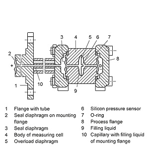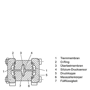 An overload diaphragm is installed to provide protection from overloads. If the measuring limits are exceeded, the overload diaphragm (2) is flexed until the seal diaphragm rests on the body of the measuring cell (7), thus protecting the silicon pressure sensor from overloads.