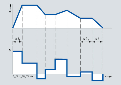 A Нагружающий момент устанавливается для каждого промежутка времени. Вдобавок к нагружающему моменту, средний момент инерции нагрузки и момент инерции двигателя должны приниматься во внимание для ускорения. Иногда необходим момент вращения трения, который работает в противоположном направлении движения.