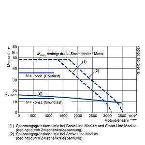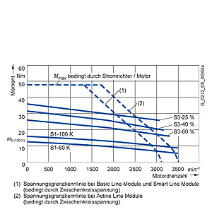 Более подробная информация о значимости редукторов приводится в описании двигателей. Среднеквадратический вращающий момент Meff должен лежать ниже кривой S1. Пиковый крутящий момент Mmax достигается во время процесса ускорения и должен лежать ниже предельной кривой напряжения для синхронных двигателей или ниже предела устойчивости для асинхронных двигателей (индукционных двигателей).