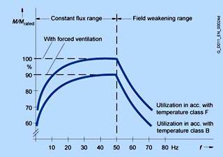 Двигатели типа 1LA и 1LGКак правило, рекомендуется использовать хорошо известные стандартные двигатели Siemens 1LA и 1LG. Что касается тепловой нагрузки, то на эти двигатели, даже при работе с преобразователями и при частичном использовании по классу нагревостойкости F, можно подавать полную расчетную нагрузку. Если необходимо использовать двигатели исключительно по классу нагревостойкости B, то нагрузку следует снизить на 10 %.