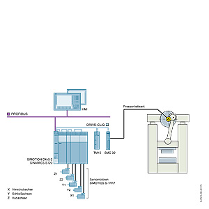 В устройствах переукладки прессов предусматривается переменное количество приводов в зависимости от конструкции машины. Чтобы быстро и гибко реагировать на сегодняшние а также будущие потребности производства, электронная переукладка SimoTrans базируется на универсальной Motion Control системе SIMOTION и платформе привода SINAMICS. Благодаря использованию SIMOTION SimoTrans имеет возможность реализовать высокодинамичное управление движением ифункциональность логического контроллера в одном устройстве, при этом исключаются высокоскоростные интерфейсы свяи. При этом можно управлять в зависимости от ведущего значения пресса всеми приводами осей синхронно и по заданным законам движения.