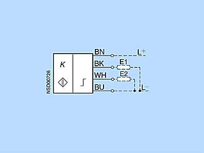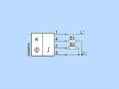 Схема подключенияDCСхема 1 Подключение датчика приближения Нагрузка E включена (функция NO) например, контактное реле, соленоидные клапаны Схема 2 Подключение датчика приближения Нагрузка E включена (функция NO) например, контактное реле, соленоидные клапаны Схема 3 Подключение датчика приближения Нагрузка E1 включена (функция NO) Нагрузка E2 выключена (функция NС) Схема 4 Подключение датчика приближения Нагрузка E1 включена (функция NO) Нагрузка E2 выключена (функция NС) например, контактное реле, соленоидные клапаны