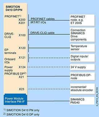 Data storage/backup The SIMOTION D410 has a 24 KB memory for remanent storage of process variables. The runtime software, user data and user programs are backed up on the SIMOTION Compact Flash Card. In the event that the SIMOTION D410 needs to be replaced, the process variables can also be backed up on the SIMOTION Compact Flash Card (CF) by means of system commands. Connectable I/Os PROFINET IO: (D410 PN only) - SIMATIC ET 200S/M/pro distributed I/Os