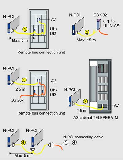 N‑PCIмодуль требует N‑PCI драйвер V1.4 и позже, который входит в поставку PCS 7/TM‑OS с V3.1 SP1 и позже. Основные возможности подключения ES/OS к CS 275 заводской шине Обзор соединительных кабелей ES/OS к шине CS 275 | Тип коннектора (см. графику) | Число коннекторов | Диапазон применения | Заранее собраннывй, длина | Заказной No. | | 1 | 4 | Для подключения N‑PCI интерфейсного модуля к модулю подключения удаленной шины (UI1, UI2 and AV) | Sub‑D socket ← 0.3 m → ES 902 ← 0.3 m → ES 902 ← 0.3 m → ES 902 | 6DS8 210-8MB | | Sub‑D socket ← 3 m → ES 902 ← 0.3 m → ES 902 ← 0.3 m → ES 902 | 6DS8 210-8MC | | Sub‑D socket ← 5 m → ES 902 ← 0.3 m → ES 902 ← 0.3 m → ES 902 | 6DS8 210-8SC | | 2 | 1 | Для подключения N‑PCI к локальной шине; подключение к существующему ES 902 коннектору, напр. к UI или N‑AS | Sub‑D socket ← 0.5 m → cable end free | 6DS8 211-8SB | | Sub‑D socket ← 5 m → cable end free | 6DS8 211-8SC | | Sub‑D socket ← 10 m → cable end free | 6DS8 211-8AD | | Sub‑D socket ← 15 m → cable end free | 6DS8 211-8ED | | 3 | 2 | Для подключения N‑PCI к локальной шине; подключение к разветвителю (AV) в устройстве подключения удаленной шины или TELEPERM M AS шкафа | Sub‑D socket ← 2.5 m → ES 902 | 6DS8 208-8KC | | 4 | 3 | Для расширения соединительного кабеля 1, 2, 3 или 4 для подключения более 2-х ES/OS систем к локальной шине | Sub‑D socket← 0.3 m → Sub‑D socket ← 0.3 m → Sub‑D plug | 6DS8 212-8MB | | Sub‑D socket← 1,5 m → Sub‑D socket ← 0.3 m → Sub‑D plug | 6DS8 212-8EC | | Sub‑D socket← 3 m → Sub‑D socket ← 0.3 m → Sub‑D plug | 6DS8 212-8MC | | Sub‑D socket← 5 m → Sub‑D socket ← 0.3 m → Sub‑D plug | 6DS8 212-8SC | |