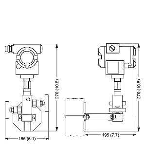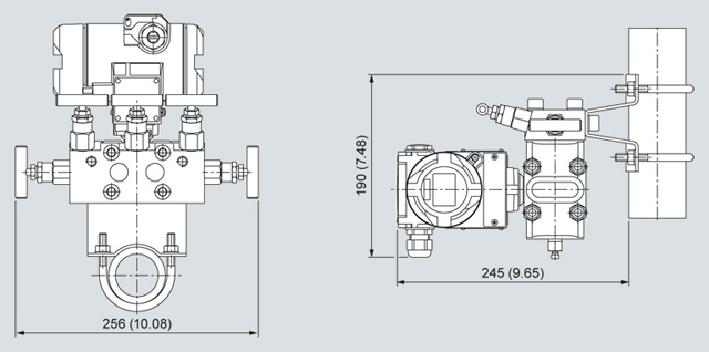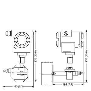 Manifold 7MF9011-4EA with mounted relative pressure and absolute pressure transmitters, dimensions in mm (inch)
