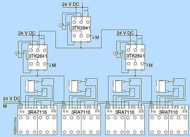 ФункцииКонтроль неисправностейВ процессе пуска устройство осуществляет самотестирование, которое направлено на проверку корректного функционирования внутренней электроники. Во время работы все элементы внутренних цепей циклически контролируются на предмет неисправностей. Каскадирование, расширениеУстройства категории 4 позволяют осуществлять простую связь (каскадирование) и расширение нескольких устройств безопасности для создания постоянно соединенных логических цепей безопасности. Для этих целей каждое устройство категории 4 имеет полупроводниковый безопасный выход (терминал 2) и вход для каскадирования (терминал 1). На терминале 1 для устройств принимается и оценивается безопасный сигнал 24 В. Если этот сигнал отсутствует, устройство безопасно отключается. Условия запуска передаются через датчик отключения (приведение в действие аварийной остановки). Нормальный режим коммутацииУстройства категории 4 имеют возможность осуществления нормального режима коммутации (On/Off) на контакторах через терминалы 3 и 4. Есть две возможности для нормального режима коммутации: любой через плавающий контакт (терминалы 3 и 4) или неплавающий (24 V DC), например, через PLC (только терминал 4). Нормальный режим коммутации зависит от функции безопасности. Принципиальная электрическая схема для каскадирования с 3TK2841 и 3RA71 электронными устройствами безопасности (категория 4 с модулями расширения) |