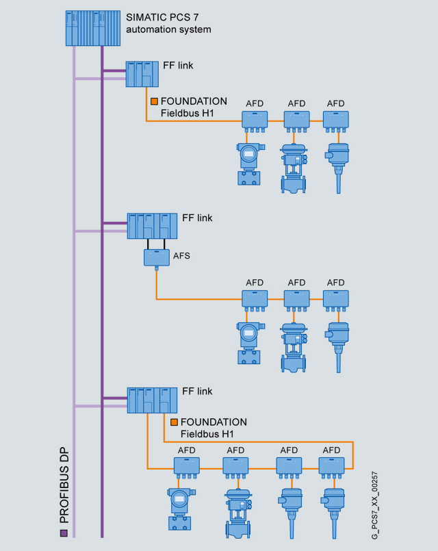 В зависимости от предпочтений PROFIBUS PA или FOUNDATION Fieldbus (FF) H1 может использоваться в PCS7 для подключения датчиков и исполнительных механизмов.