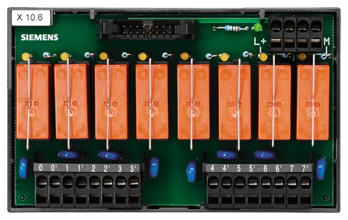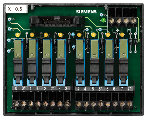 | | 2 x 2 клеммы для подключения потенциала 24 В пост. тока Светодиоды для сигнализации Реле с разъемами Нижний ряд Клеммы 0 - 7: Клеммы для полевых сигналов (выходы) при 2-проводном подключении |