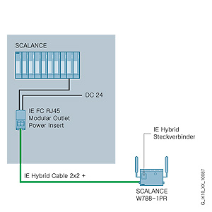 IE гибридный кабель 2x2 + 4x0.34 и IE FC RJ45 модульная розетка с подключением питания могут быть использованы для подключения удаленных станций (например, точек доступа SCALANCE W) одновременно к данным (10/100 Мбит/сек) и питанию. Стоимость монтажа может быть значительно снижена, т.к. данные и питание передаются через общий кабель.