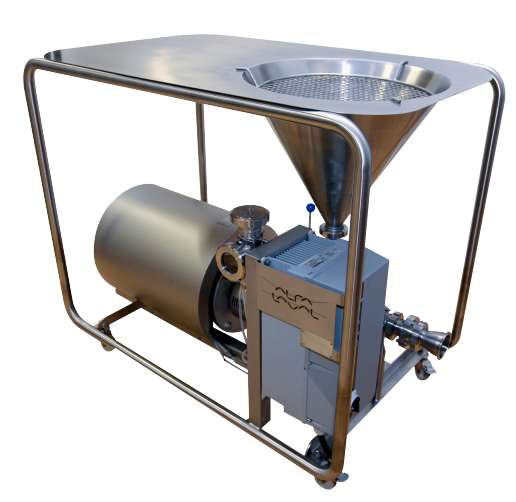 В конструкцию гибридного смесителя сыпучих продуктов входит двухступенчатый насос с одной роторно-статорной ступенью и одной насосной ступенью. Устройство оснащено электродвигателем с