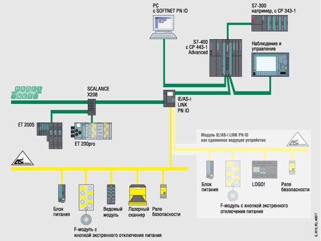 Контроллер ввода-вывода PROFINET IO способен выполнять циклический обмен данными ввода-вывода с AS-Interface. Контроллер ввода-вывода, поддерживающий службы асинхронного обмена данными, позволяет дополнительно использовать вызовы ведущего устройства AS-Interface. Таким образом, модуль IE/AS-i LINK PN IO является идеальным решением для построения систем распределенного ввода-вывода, в которых AS-Interface выступает в качестве подсети сети PROFINET IO.
