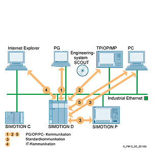 SIMOTION интегрирован в коммуникационную архитектуру Industrial Ethernet, т.к. каждое устройство SIMOTION обладает по умолчанию как минимум одним разъёмом Ethernet.Industrial Ethernet в основном используется для обмена данными. Для SIMOTION циклический обмен данными процесса с приводами и распределёнными периферийными устройствами реализуется по PROFIBUS DP и PROFIdrive. В будущем PROFINET объединит обмен данными и циклические коммуникации процесса для SIMOTION на базе Ethernet.