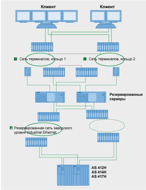 При повышении требований к надежности следует рассмотреть прежде всего кольцевую структуру сети. Если требования к надежности особенно высоки, процессная шина может быть сконфигурирована как двойное резервированное кольцо (два CPs на AS CPU и OS сервер). Двойные ошибки такие как ошибка коммутатора на кольце 1 с одновременным обрывом шинного кабеля на кольце 2 все еще не приведут к потере трафика. Два кольца физически разнесены друг от друга в такой конфигурации. Коммуникационные партнеры связаны логически друг с другом с использованием конфигурационного пакета NetPro с использованием отказоустойчивых S7 соединений (4‑кратное резервирование). Один SCALANCE X414‑3 коммутатор на каждом кольце принимает на себя функции менеджера резервирования.