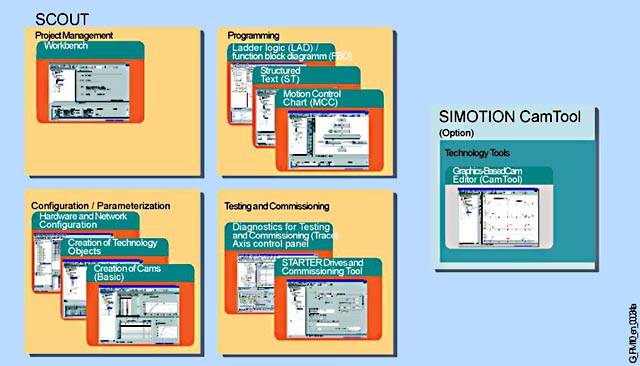 Диапазон возможных применений SIMOTION простирается от простой, параметрируемой, управляемой по скорости оси, до комплексных, программируемых и интегрированных с механикой (мехатронных) многоосевых машин. SCOUT - это система инжиниринга для SIMOTION, интегрируемая в STEP 7 и обеспечивающая все необходимые инструменты для: