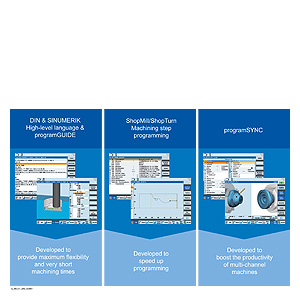 Программирования G функции с поддержкой циклов были объединены в programGUIDE. ProgramGUIDE обеспечивает максимальную гибкость и короткое время обработки и идеально подходит для работы со средне и крупносерийными партиями деталей. SINUMERIK также поддерживает ISO код программирования. ShopMill и ShopTurn пошаговые пакеты программирования приспособлены для производства одной или небольших партий деталей, другими словами, они идеально подходят для цехового программирования.